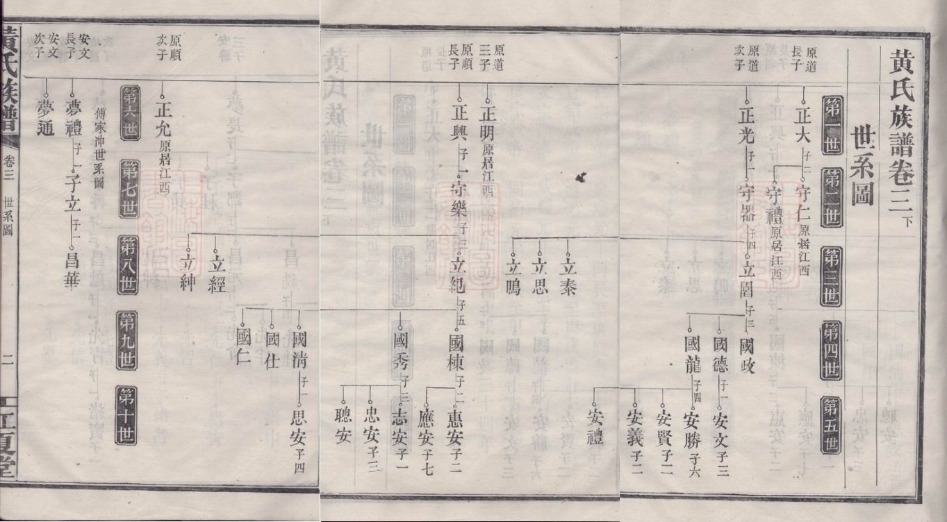 明嘉靖间,正兴因业医,徙居宁乡双江口之冯家屋场(今益阳赫山区新崇安村冯家屋场)、姚家冲(今宁乡双江口镇姚家冲)。谱序又称湘阴姚家冲黄氏。卷一聖諭、凡例、家規、儀節,卷二序、溯源、遷徙等,卷三紀年、世系圖,卷四、五世系,卷六墳圖、契據。書名據版心、書衣、書名頁、卷端題。宗祠在双江口祖屋。
