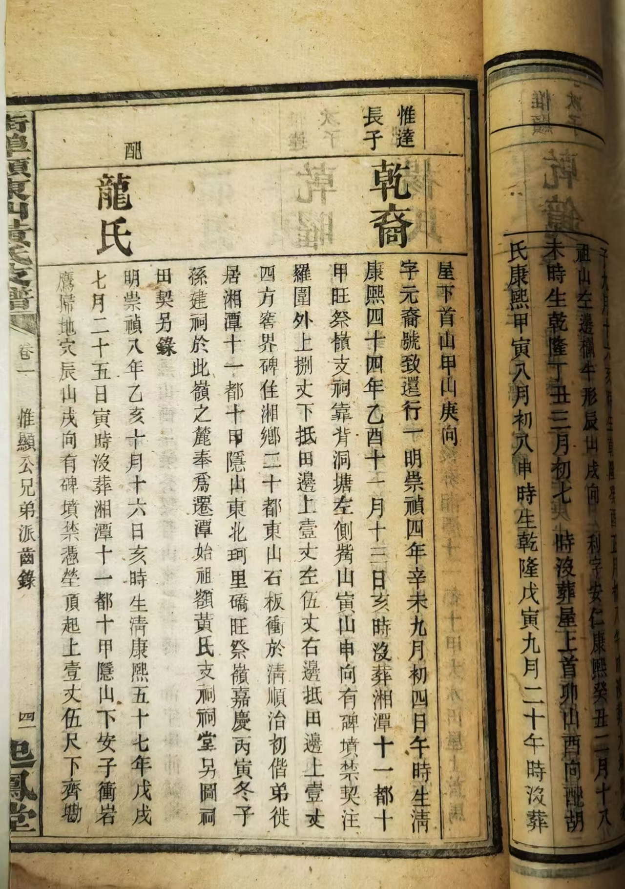 致还公,讳乾裔,字元裔,行一。系辰祖之孙、惟达之子。生于明崇祯四年辛未九月初四日午时,殁于清康熙四十四年乙酉十一月十三日亥时,享年七十四岁。