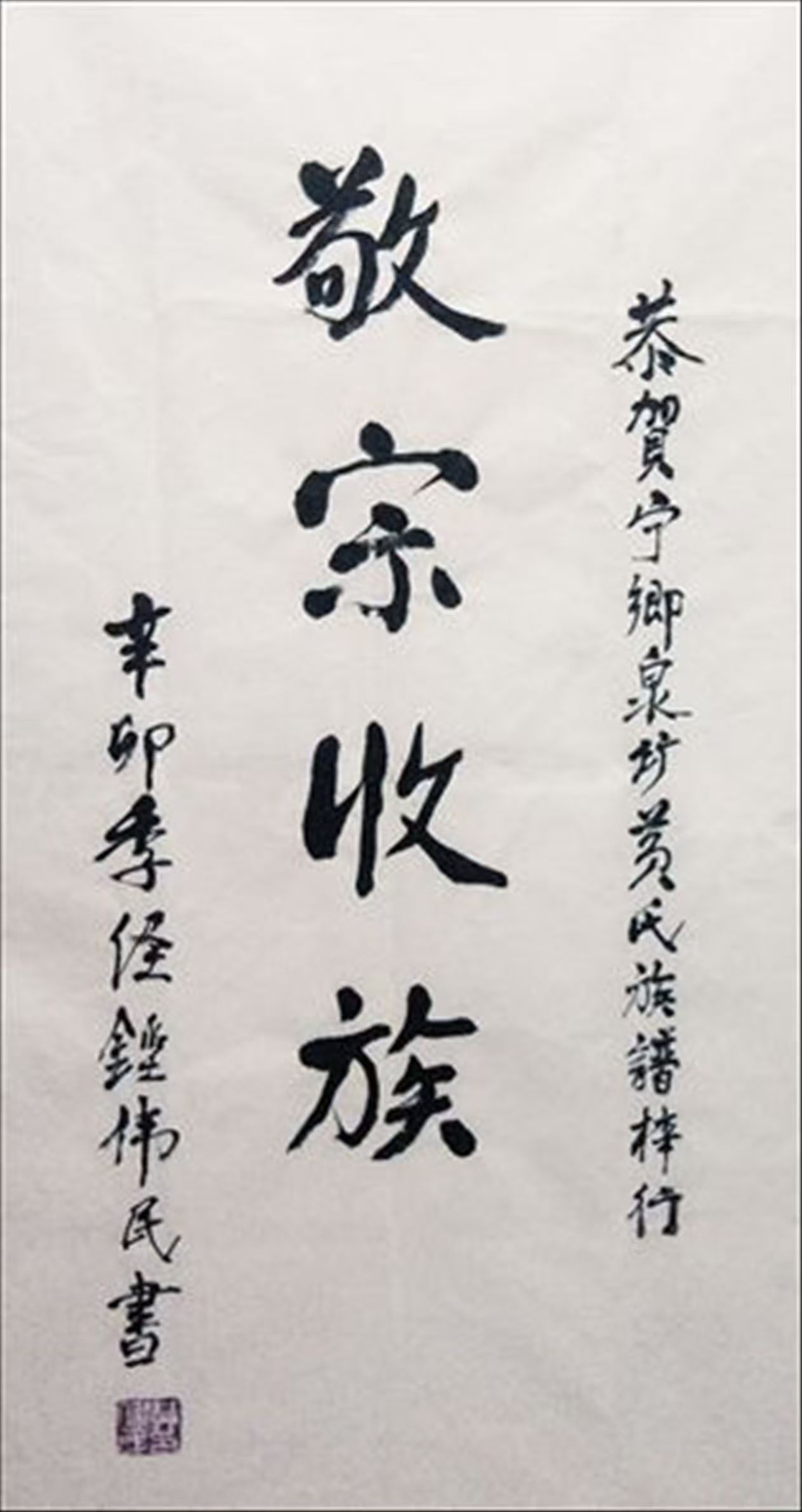 2012年,伟民宗长闻宁乡泉塘黄氏九修族谱,欣然题词:敬宗收族。